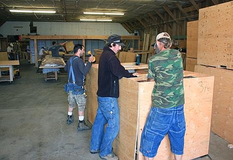 SANDPOINT — Tucked away from view, two local woodshops hum like a high-power line at peak capacity. Inside the buildings, the sound of nail guns pierces the morning chill as sheets of plywood are joined around pallets of merchandise and a small forklift tries to stay ahead of the game by as it rumbles out the door with a cargo of plywood crates.