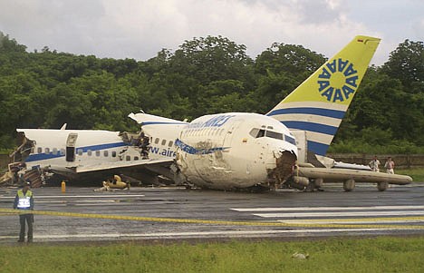 The plane hit short of the runway on Colombia's San Andres Island and skidded on its belly as the fuselage fractured and bits of landing gear and at least one engine were ripped off. The jet wound up on one end of the runway, crumpled and in pieces, as passengers scrambled or were helped to safety.