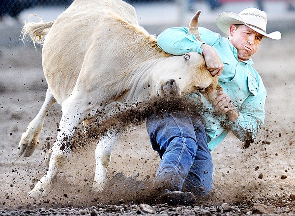 In steer wrestling, Jess Cowie of Foremost, Alberta, turned in a 5.2 to win the evening - and take the overall lead. Three cowboys, Ted Gollaher of Cascade, Nick Stubblefield of Choteau, and Travis Carnine of Templeton, Calif., turned in 5.7.