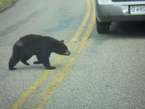 Five miles later, another bear, this one a smallish grizzly, lumbers across the road and I pull slowly to a stop. As the bear starts up the short hill on the other side of the road, it stops, glances in our direction and looks back from where it came. It is then two cubs, about 40 pounds each, trot after their mom. They pass directly in front of our van, and Nick snaps a few pictures.