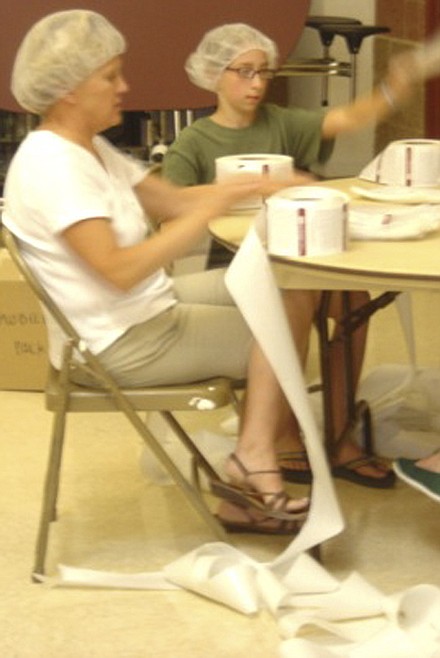Though the ingredients are purchased by donated money, the manna packs are all produced by volunteers. Each meal costs 19 cents to produce and 94 percent of total donations to FMSC goes directly to the feeding program.