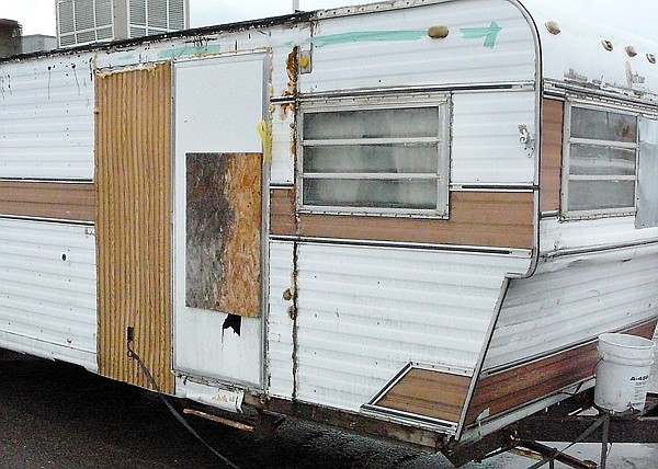 A 1973 Sunflower model with license plate 2C 70254, the trailer remained in the parking lot Friday with a note on the door giving the phone number of the animal shelter. It was parked on the far east side of the ShopKo lot with the door the dogs broke through facing east next to piled-up snow.