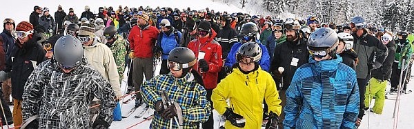 A large lineup of skiers and snowboarders wait for the chairlift at Chair One to open up at Big Mountain's opening day.