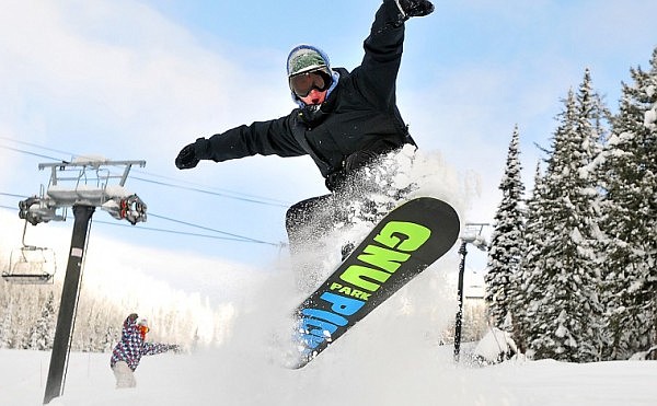 A snowboarder grabs some air as he heads down the mountain during opening day at Whitefish Mountain Resort at Big Mountain on Dec. 4.