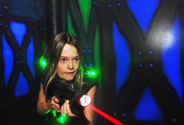 Danielle Rosenberg, 11, fires a shot from gun during a game of Laser Tag at the Zone Family Fun Center on Wednesday.