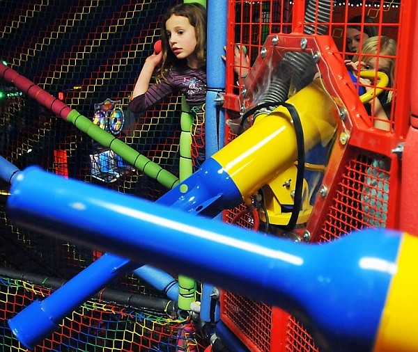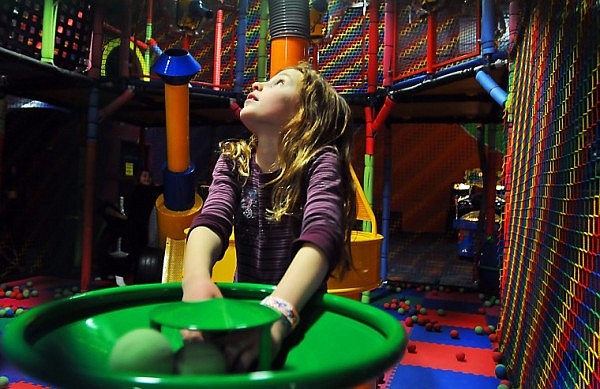 Gaee Giblin fires ball through a canon on the second level of a play pen.