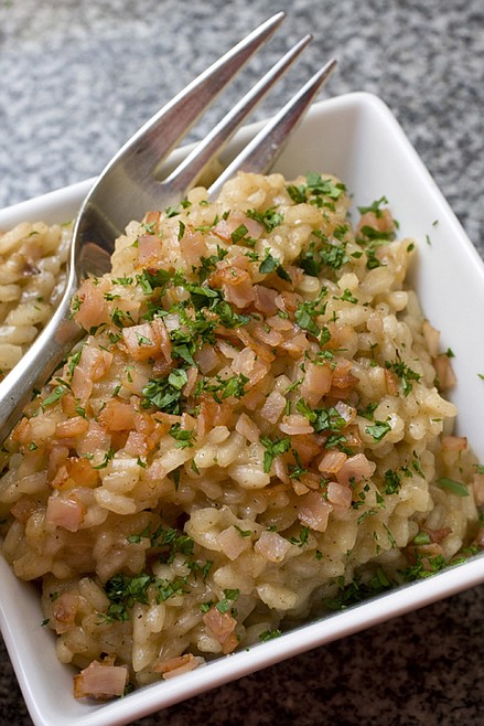 In this easy risotto, I used diced and crisped turkey breast to up the meaty, savory notes. Ham or prosciutto would be great, too.