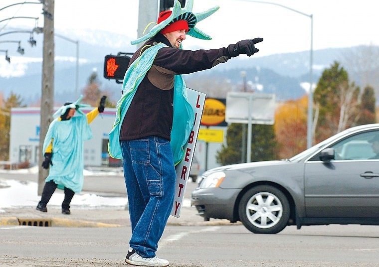 Scott Purdy points toward a passing driver while co-worker Anthony Tressel waves from the corner of U.S. 2 West and Meridian Road on Tuesday afternoon. The two were advertising for Liberty Tax Service.