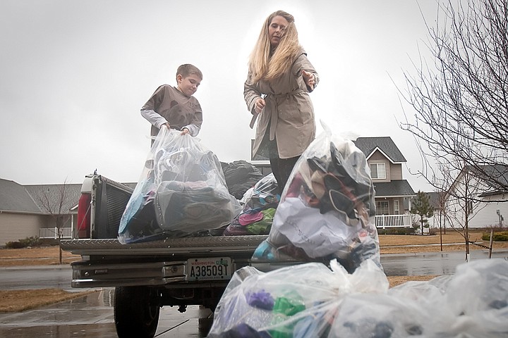 Her first stop in Coeur d'Alene was Century 21 Beutler & Associates, at 1836 Northwest Blvd., where 13 large plastic bags stuffed with 323 pairs of shoes were loaded by her 9-year-old son, Avery, and others.