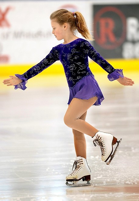 Claire Schmidt, 8, of Hungry Horse tests in the Moves in the Field competition on Friday at the Stumptown Ice Den in Whitefish. The local figure skating competition continues today from 9 a.m. until 5:30 p.m.