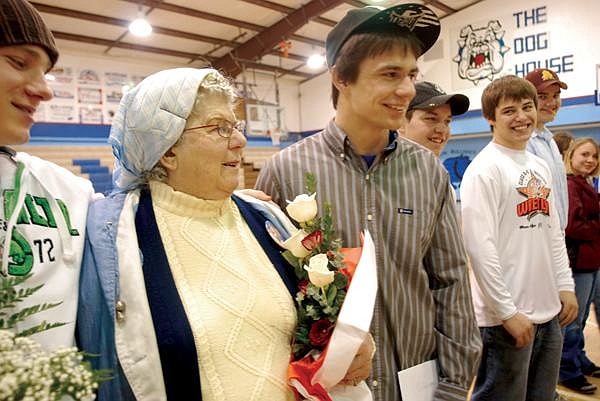 When Grandma Dumont’s name was called, she rose to accept several bouquets of roses in total surprise. As she stood under the arm of grandson Travis in the center of the gym, the honor brought tears to her eyes. The faces of the boys stretching from her sides were all smiles.