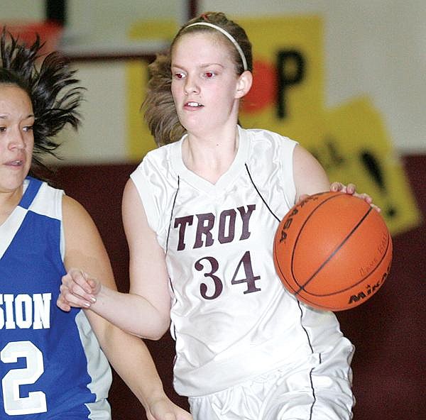 While first-year coach Neil Newton chatted with his team during a timeout, the game clock overhead showed 1:43 remaining in the first half with the Troy girls basketball team holding a 20-9 lead over District 7-B tournament opponent Mission.