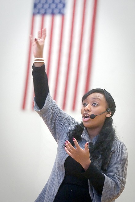 In her 14 performances in local schools this week, Davenport, an actor from Seattle's Living Voices drama firm, portrays a young African American growing up in the South in 1965. She conveys the story of the struggle and sacrifice for freedom and civil rights through a fictional character with real life footage from the era on a screen behind her.