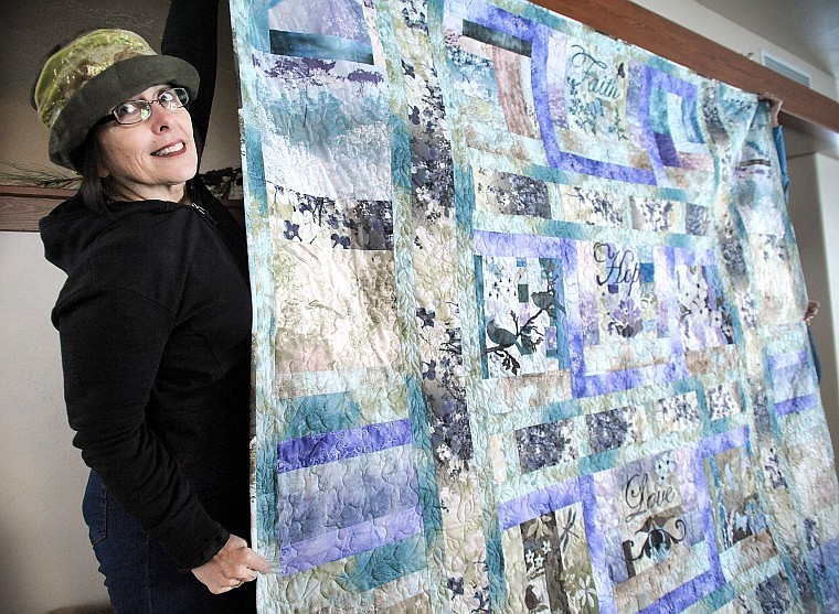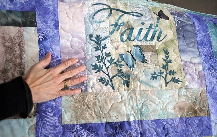 THE QUILT, which measures 92 by 102 inches, was inspired by and includes McKenna Ryan “Faith, Hope, Love” art quilt series blocks, with a “Faith” block signed by Ryan.