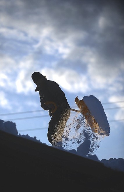 Duane Peterson of Whitefish shovels snow from his roof on Monday. Peterson said he was anticipating rain and did not want to have too much weight on the roof.