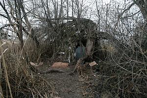 The area is next to his law office on East Riviera Avenue. It’s comprised of thick Russian olive trees and other shrubs. Vagrants have made a home out of the brush complete with an entrance door and pathways. The area is covered in garbage and a broken chair.