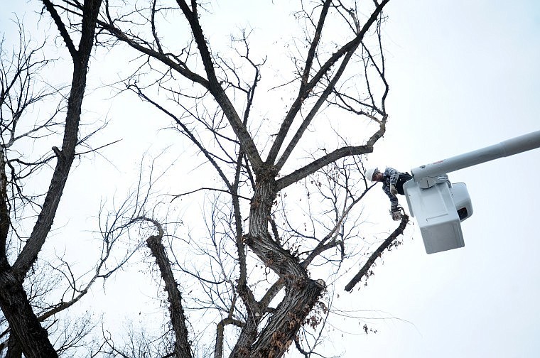 Brendon Limpo cuts limbs from a tree infected with Dutch elm disease on Second Avenue East on Tuesday morning in Kalispell. Limpo is part of the crew from Aspen Urban Forestry that will take down about five infected trees per day, depending on the size and location of the trees. Crews will work in one-block areas along Second Avenue this week and into early next week, according to Mike Baker, Kalispell Parks and Recreation director. He said that after that crews would begin working on Third Avenue East. Tree work will continue into April to remove 75 to 90 trees in Kalispell.