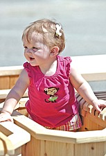 10-month-old Isabella Lund, of Ronan, checks out the cedar furniture being sold during the Cherry Festival last weekend in Polson.
