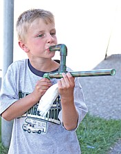 7-year-old Trevor Bartel, of Ronan, tests out the latest addition to his armament, a mashmellow shooter, at the Cherry Festival last weekend in Polson.