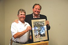 Met by a loud round of applause and the presentation of a framed aerial photograph of the Flathead watershed, Schweitzer claimed to have been a "very, very small part of this."