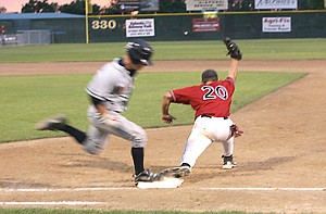 Duncan Blades (Salt Lake CC) would score in the bottom of the eighth inning on a Michael Bush (Lewis and Clark College) ground out to narrow the gap a bit more, but then the Bellingham pitchers tightened up and kept Moses Lake from doing any more damage.