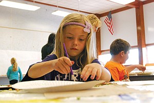 On the opposite end of the hallway, the fifth and sixth grade room was more peaceful during a drawing lesson. Campers quietly concentrated on drawing pheasants and ducks. The day before, however, was noisy as kaleidoscopes were created.