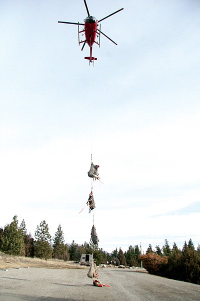 BIG ARM — For a second it was surreal, like a scene out of “Jurassic Park”: A group of bighorn sheep dangling from the bottom of a helicopter, like a delicious treat for a hungry Tyrannosaurus Rex.