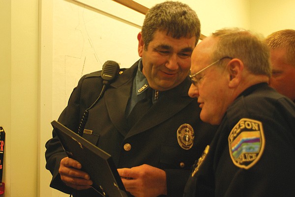 Earlier in the meeting, six law enforcement officers were honored for their extraordinary efforts. Chief Chase read a description of each act meriting the awards, and was then honored himself by surprise for his efforts during the bridge jumping incident in late January.