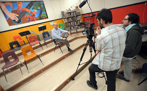 Steve Eckels of Flathead High School being interviewed by Corey Gegner and Matt Cascella, both 24 and of Brooklyn, N.Y. for their documentary "Band" on Tuesday in Kalispell.