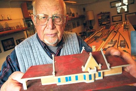 In the shop behind his home, he hoists a small model of the Sandpoint train depot from a siding the size of a canoe paddle that includes a strip of blue and a few model buildings.