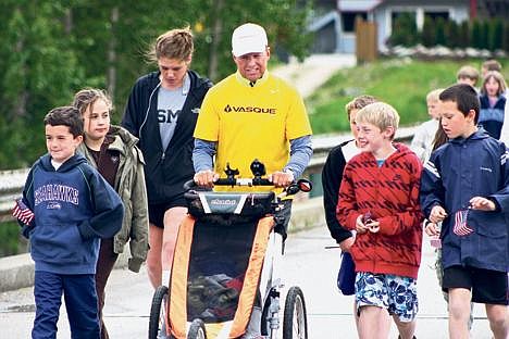 There is now a long column of these little flags — about 600 of them stretching from the Pacific Coast near Astoria, Ore., to just shy of the Idaho/Montana border. Hope resident Mike Ehredt will cross the state line and plant more of them today, running solo for about 30 miles and stopping for the night in Trout Creek, Mont.