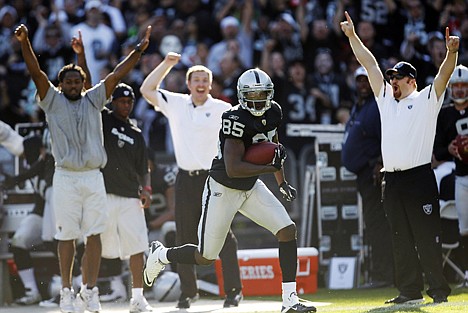 The first of those breaks came on a third down late in the third quarter. Campbell's slant pass hit off Darrius Heyward-Bey's knee, bounced up and was bobbled by Jacoby Ford before Michael Bush picked it out of the air and rumbled for the big gain. That set up one of Sebastian Janikowski's four field goals to give Oakland a 16-0 lead.