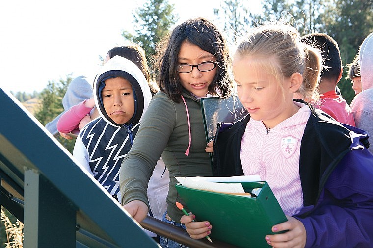 POLSON — First Lady Nancy Schweitzer and Montana Department of Transportation Director Jim Lynch met with 5th grade students from Polson Middle School and featured speakers Seth Makepeace, a Confederated Salish and Kootenai Tribal hydrologist and Tony Incashola, Director of the Salish-Pend d’Oreille Culture Committee, last Tuesday at the Highway 93 pull-out on Polson Hill for the official unveiling of “The Beaver’s Dam” roadside geology marker and a day of learning in “Montana’s classroom.”