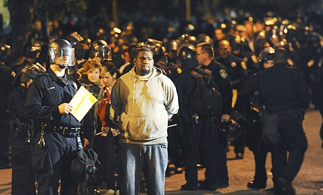 The arrests began around 8 p.m. on Friday after officers were pelted with rocks and bottles. One officer had his gun taken from him in a fight and another was hit by a car and suffered what police described as a non-life-threatening injury, Oakland Police Chief Anthony Batts said.