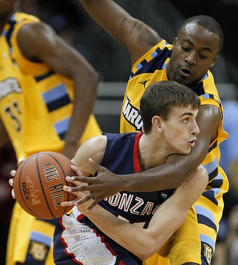 Gonzaga had a 3-minute scoreless drought late in the game and Marquette was able to get within 65-63 on a 3-pointer by Butler with 43 seconds to go. Gray was dribbling the ball near midcourt running off some time when he was double-teamed and it looked like it would be at least a jump ball - Gonzaga had the possession arrow - but a foul was called on Darius Johnson-Odom.