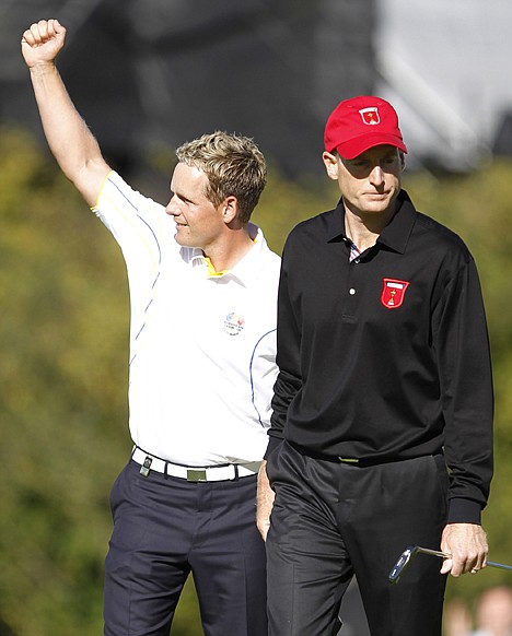 Luke Donald, who along with Poulter won three matches this week, twice made 20-foot birdie putts when Jim Furyk was inside 4 feet to halve the holes and keep the lead, and keep Celtic Manor humming with cheers of "Luuuuuuuuuke!"