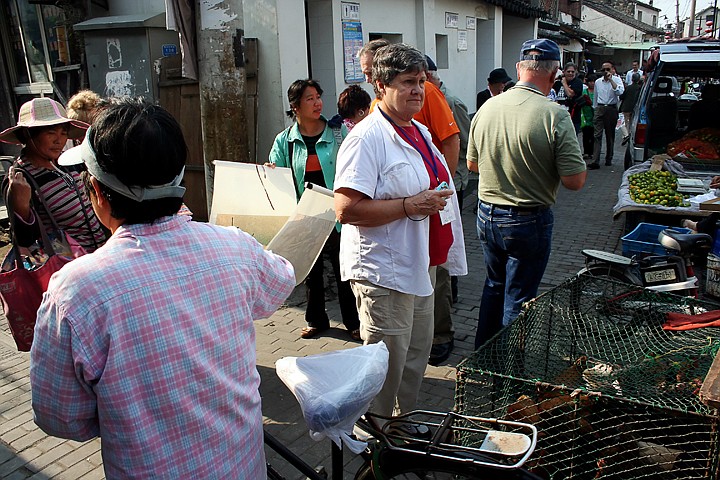 The boats stopped for a brief jaunt in a traditional marketplace by the canal, where vendors were cramped in alleyways.