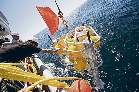 Plankton, tiny suspended particles that form the base of the ocean's food web, float en masse 1,400 feet beneath the surface of the Gulf of Mexico, forming a snowy-like underwater scene as they move with the currents outside the windows of a two-man sub creeping a few feet off the seafloor.