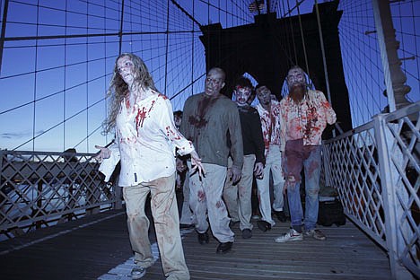 Two dozen zombies, their clothes spattered with fake blood, were staggering up and down the block outside Madison Square Garden. Downtown, others shuffled across the Brooklyn Bridge.