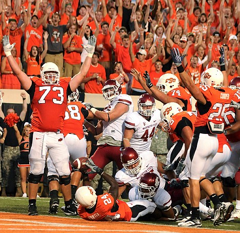 Brandon Weeden threw three touchdown passes for the Cowboys, all to Justin Blackmon and Blackmon also scored on a 7-yard blocked punt return. The Cowboys have won 15 straight home openers, the longest streak in school history.