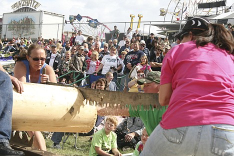 Mary Hasenoehrl, from Lewiston, worked a crosscut saw alongside St. Maries Mayor Tami Holdahl, who also emceed the contest. Sliding the saw back and forth across the log, the two women made a clean cut.