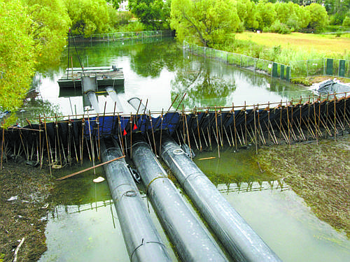 Portable dams made of steel frames and plastic sheeting were erected near the railroad trestle and at the Second Street bridge. Once the large pipes were connected to the dams, the water in between was pumped out to treatment facilities temporarily set up in the BNSF rail yard near the roundhouse.