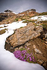 It wasn't long before the grasses turned to shale and the ridge flattened and turned west toward the peak. With thunder clouds looming, the Nunlists picked up the pace. I was almost running to keep up, happy to have my trusty trekking poles for balance. We hit fresh snow just before the final push to the summit. Now, we could clearly see Gray Wolf and No Fish Lake sparkled like a gem at the bottom of the basin.