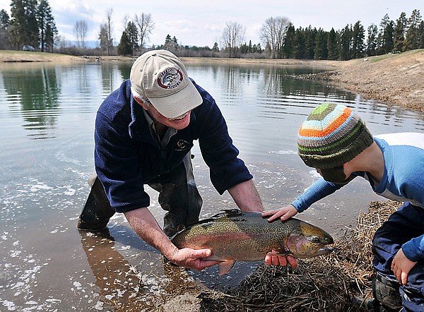 Rick Wolf shows off a massive rainbow trout to Spencer Soteros before letting it loose in Pine Grove Pond on Wednesday morning.