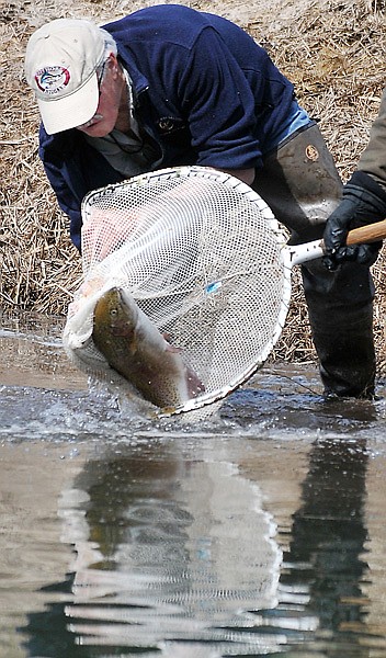 Rick Wolfe gives a small nudge to a rainbow trout to get out of a net.