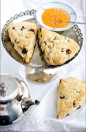 Classic to afternoon teas, scones are commonly baked plain or studded with currants, then accompanied with jam and clotted cream, a thick, creamy spread. You can make your version with any dried fruit, such as blueberries, cranberries or apricots. You also can add chopped nuts or chocolate chips.
