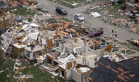 ST. LOUIS - Debris from splintered homes covered the ground in neighborhoods around St. Louis, while topped trees and overturned cars littered lawns and driveways. From the air, one home looked like a dollhouse that had had its roof lifted off. Looking down, the dining room table and other contents could be seen, damp in lingering rain.