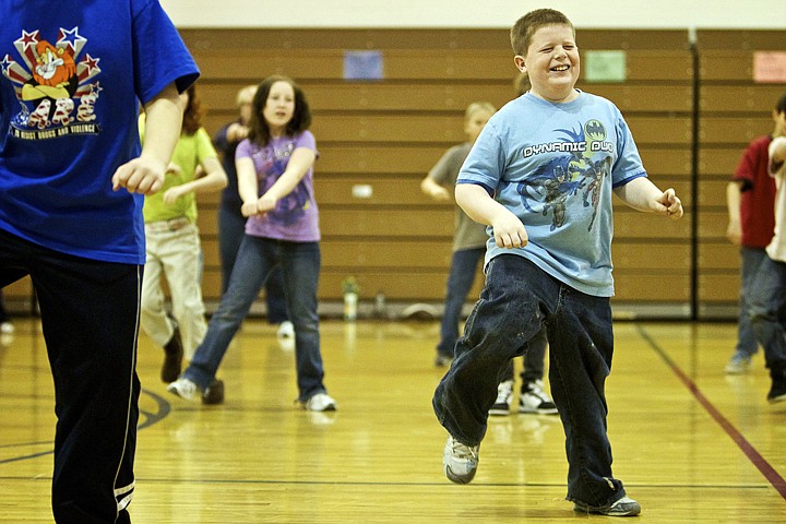<p>JEROME A. POLLOS/Press Trace Walker giggles as he works through the steps of a Zumba class Wednesday at Seltice Elementary in Post Falls. Peak Health and Wellness in Post Falls recently donated $1,000 for the school's exercise program to help continue physical education activities for students next year. "The kids absolutely love it," said Laurie Buckel, a fifth-grade teacher at Seltice Elementary. "We have noticed increased school attendance rates on Wednesdays and greater student focus after the exercise session."</p>