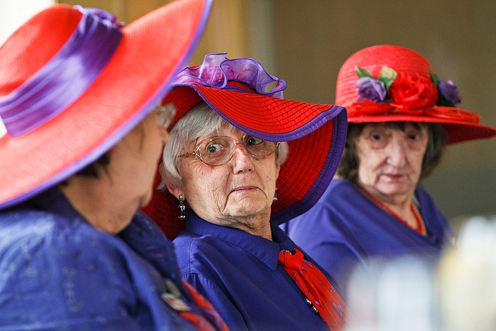<p>SHAWN GUST/Press Doreen Schneider, a new member of the Red Hat Tootsies, visits with other members of the group Wednesday during a regular activity that included lunch at Beverly's at the Coeur d'Alene Resort. The group meets monthly to discuss upcoming events and organize collections for soldiers who are serving active duty.</p>