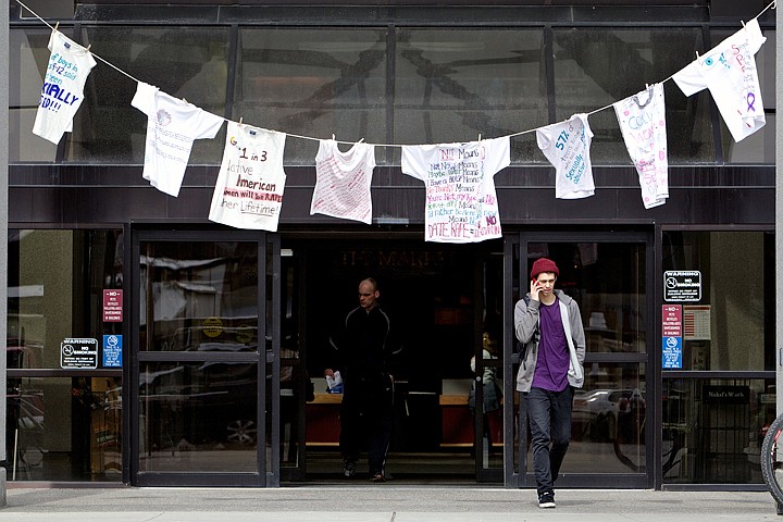 <p>JEROME A. POLLOS/Press Brandon De Simone talks on his phone Thursday as he walks under shirts hung in front of the Student Union Building at North Idaho College. The display was part of "The Clothesline Project" which told personal stories with written messages from sexual assault victims in the community as part of the National Sexual Assault Awareness month.</p>